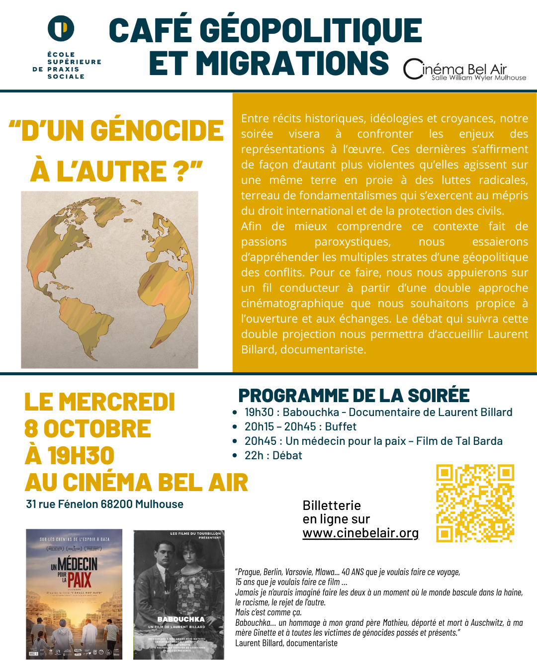 Nous vous donnons rendez-vous le mercredi 8 octobre à 19h30 au Cinéma Bel Air – 31 rue Fénelon, 68200 Mulhouse.